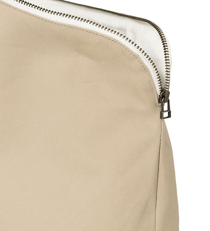 Fin Studio Feder toalettveske i beige med hvit glidelås og svart logotrykk foran.