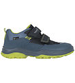 Vakre Superfit sko i en kombinasjon av blått og svart med grønne detaljer. Superfit -skoene lukkes med borrelåsstropper over vristen. Innsiden er det tekstil og uttakbare innleggssåler. Skoene har lette yttersåler med et grovt mønster under bunnen, noe som sikrer godt fotfeste.