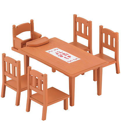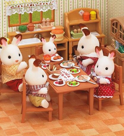 Sylvanian Families spisebordssett har plass til hele familien, både mor og far, storesøster og stor og den lille baby.