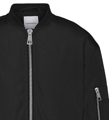 Vero Moda Girl jakken har høy ribbet krage og lange ermer med brede elastiske kanter. På venstre arm er det en flott lukket lomme. Den åpnes foran med en sølv gjennomgående glidelås, og foran er det stor lommer på sidene, som også åpnes med en trykknapp.