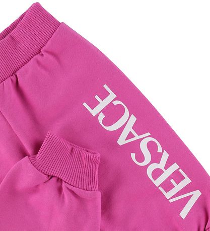 Vakker Versace joggebukse i rosa, og nedover venstre bukseben er "Versace" trykket med stor, hvite bokstaver.