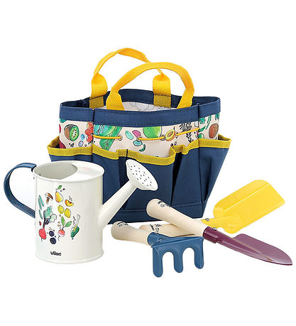 Vilac vesken med hageredskaper er det perfekte utstyret for en liten hagehjelper. Nå kan barnet virkelig komme ut i hagen og hjelpe til. Hageredskapene har trehåndtak som passer til en liten barnehånd og et metallhode. Hageredskapene utvikler barnets motorikk og følesans, og barnet blir kjent med naturen.