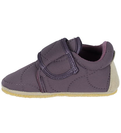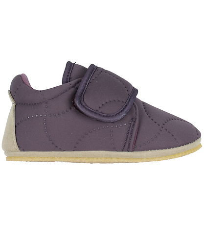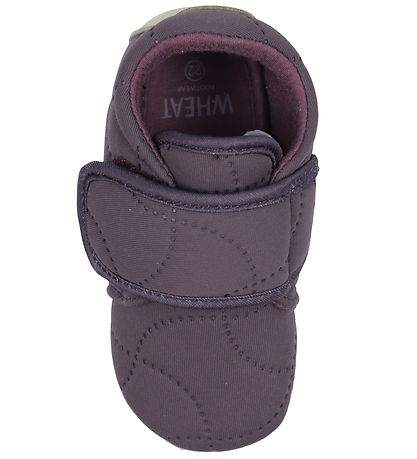 Vakre Wheat tøfler i mørkelilla med quiltet struktur, som kjent fra termoklær. Rundt hælen er lys grå semsket skinn med preget "W".
