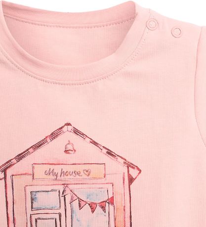 Vakker Wheat t-skjorte i ensfarget lyserød med et stort, fint trykk av et rosa hus foran.