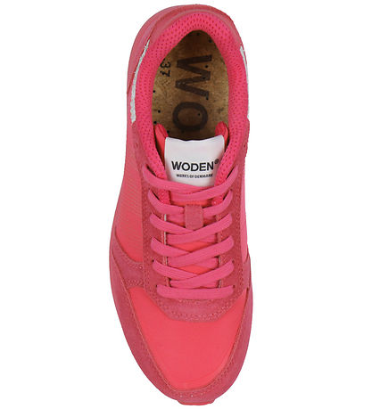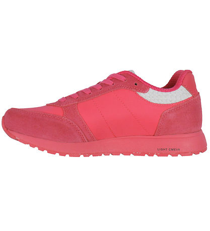 Vakre Woden sko i rosa semsket skinn og tekstil samt fiskeskinn i off hvit.