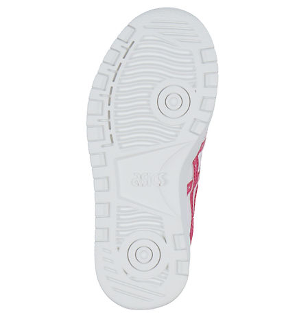 Snygga Asics skor i vit imiterat skinn med i rosa logotyper på sidorna.