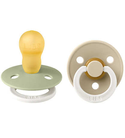 Smarta BIBS lysande nappar säljs i 2-pack i dammgrön och cremevit med vita säkerhetsringar.