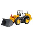 Smart Bruder arbetsmaskin i form av en Volvo L260H gummiget med funktionell grävskopa fram. Arbetsmaskinen är i gult och svart färgtema och framstår helt som den äkta varan i skalan 1:16.