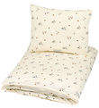 Snygga Cam Cam Copenhagen sängkläder i en cremevit färg med en söt blommor och kanintryck i rosa och beige.