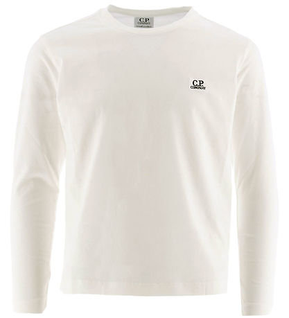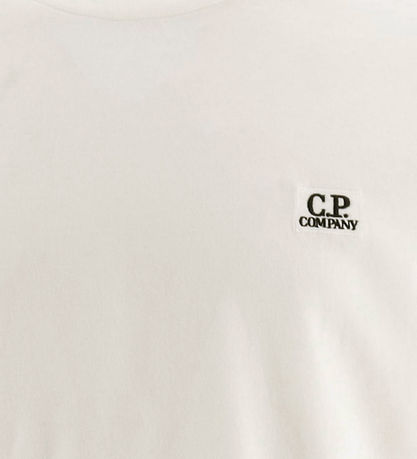 Fin CP Company- tröja i enfärgad vit, och på vänster sida framtill finns en liten, vit varumärke med namnet "CP Company" broderad i svart.