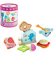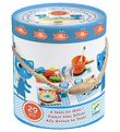 Djeco uppsättningen består av en hamburgare med alla möjliga läckra tillbehör att ta i, en ketchup, en cola och pommes frites. Uppsättningen kommer i en låda som kan användas som brickor till maten.