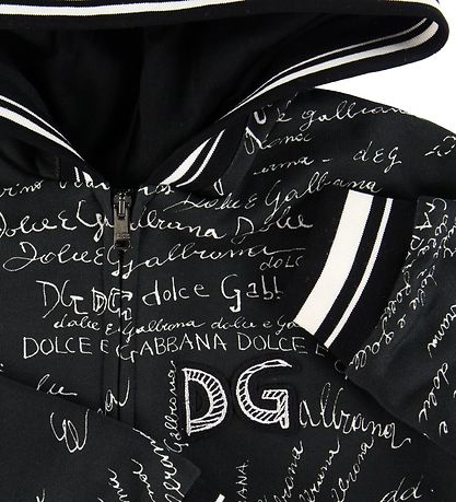 Trendig Dolce & Gabbana cardigan i svart sweat med ett heltryck av olika text, skrivet med handskrift, och på framsidan på vänster sida appliceras bokstäverna "DG" i svartvitt, längs kanterna finns vita ränder.
