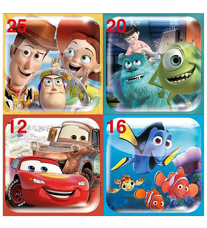 Fantastiskt Educa pussel med 4 olika pussel på 12,16,20 och 25 delar, som tillsammans visar olika roliga scener från Disney Pixars Toy Story, Bilar, Hitta Nemo och Monsters Inc