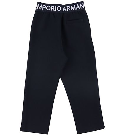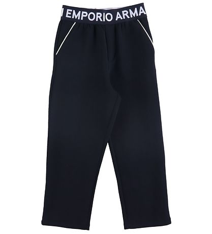 Snyggt Emporio Armani set, bestående av en cardigan och ett par byxor i marinblå. Nerför ärmarna och över bröstet och runt midjan på byxorna finns en bred, marinblå logorand med namnet "Emporio Armani" broderad i vit.