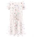 Emporio Armani klänningen är helt ärmlös, och det är en fin volang runt bröstet, ryggen och över axlarna. Klänningen har resår i midjan, och undertill faller kjolen med bra vidd. I halsöppningen sitter den tätt, och den öppnas fram med dolda knappar och en enda, vit knapp i halsöppningen.