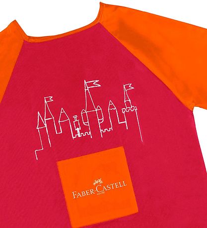 Fint Faber-Castell förkläde i röd och orange med fint tryck och märkets namn framtill i vit.