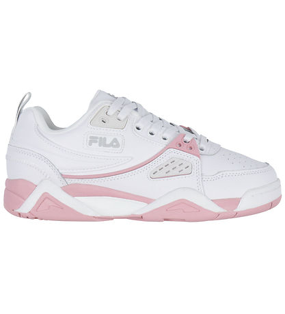 Vackra Fila sneakers i belagt läder och textil i vit med rosa gummidetaljer. På utsidan finns en Fila logo i grå och på plösen och hälen finns ett logotryck i grå.