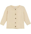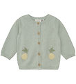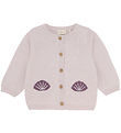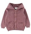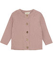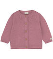 Mjuk Fixoni cardigan i en varm rosa nyans med stickat struktur. Cardigan har långa ärmar och rund halsringning. Det finns genomgående knappar framtill med vackra detaljer längs knapparna och längst ner på cardigan. Alla öppningar på koftan har smala ribbade muddar/ribbad mudd.