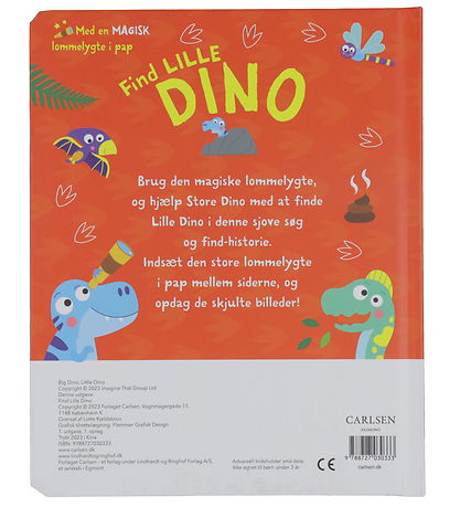Forlaget Carlsen boken är en rolig upptäcktsbok där barnet kan gå på upptäcktsfärd med den magiska ficklampa och hjälpa Stora dino att hitta Liten dino. Bokens sidor är gjorda av kraftig kartong, så de tål att vändas om och om igen.