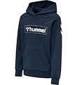 Smart Hummel hoodie i marinblå med "Hummel" tryckt på bröstet, och nere på båda ärmarna är det bränd orange ränder med vita vinklarna.