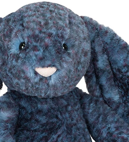 Läcker Jellycat gosedjur formad som en kanin i blå plys med rosa detaljer, långa öron och en rosa nos.