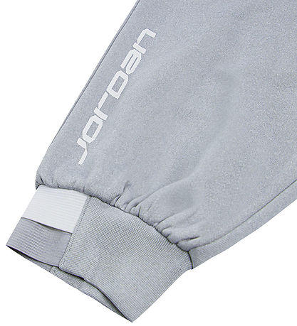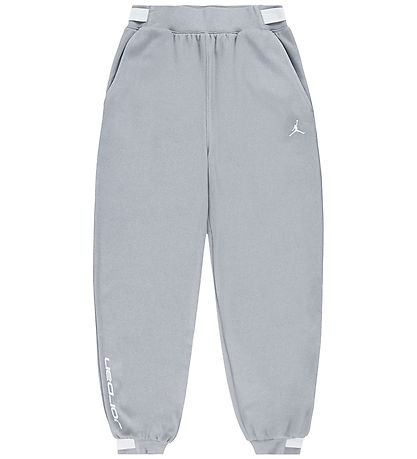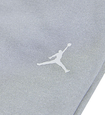 Snygga Jordan sweatpants i grå färg med en liten, vit logo på vänster lår och "Jordan" tryckt i vit längs höger ben. Mjukisbyxorna har resår i midjan och vid anklarna, vilket ger en bekväm passform. Upptill finns en snedställd ficka på varje sida. Inuti finns mjuk, borstad bomull.