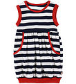 Vacker Katvig ärmlös klänning i mönster med marinblå och vita ränder. Klänningen har en mjuk passform med praktiska fickor framtill och röd kant som ger en livlig look.