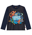 Vacker LEGO® Wear blå med långa ärmar i en mörk färg. Framsidan pryds av ett färgglatt "Stronger Together" tryck med figurer som fångar ögat.
