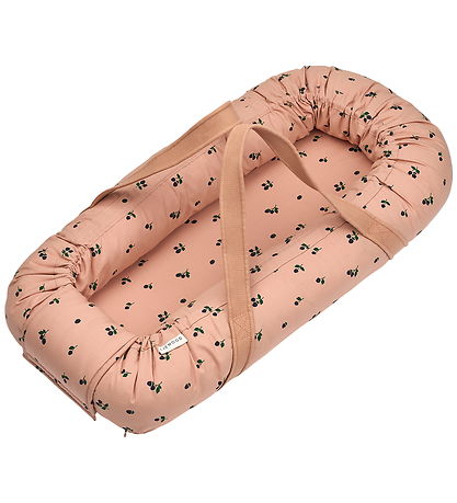 Fin Liewood kombinerat babynest och liggdel i rosa med tryck av små bär över hela.