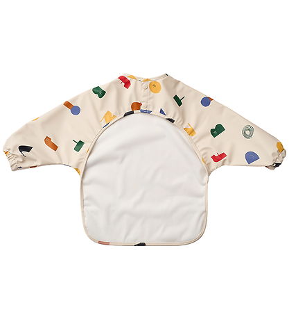 Praktiskt Liewood förkläde i en ljus, beige nyans och med ett färgglatt heltryck med olika motiv. Liewood förklädet har långa ärmar med resårkanter, en ficka nertill och en praktisk tryckknappsknäppning i nacken.