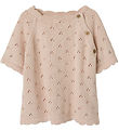 Snygg T-shirt från Lil' Atelier i rosa med detaljerat hålmönster i stickat struktur. T-shirten har korta ärmar och dekorativa knappar, vilket ger en snygg och luftig look till vilken outfit som helst.