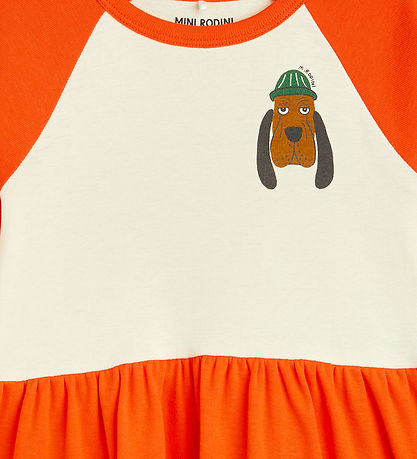 Vacker Mini Rodini klänning i röd, med en benvit överkropp, och ett tryck av en brun hund med en mössa i grön på vänster bröst.