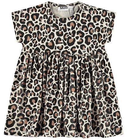 Elegant Molo klänning i beige med leopardmönster i nyanser av brun och svart. Molo klänningen har korta ärmar och en lös passform med gott om vidd i kjolen. Klänningen stängs vid vänster axel med tryckknappar.