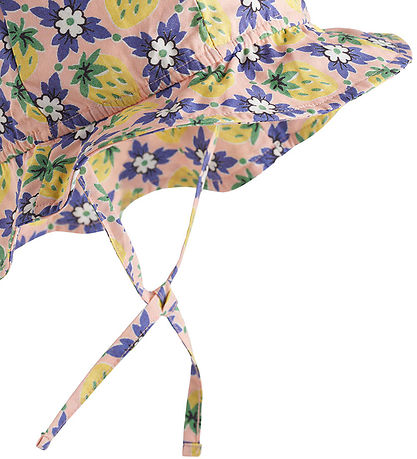 Funktionell Molo sommarhatt med ett livfullt tryck av gula frukter och violetta blommor på en rosa bakgrund. Molo sommarhatten har en bred skärm och ett smalt resårband runt hela huvudet, och den har praktiska snöre/snörning så att den kan knytas under hakan.