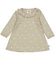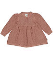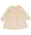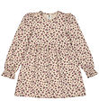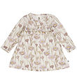 Vacker Müsli i klänning med blommönster i rosa nyanser. Müsli har långa ärmar med puffärmar och en smal resårmudd med volang. Klänningens kjol har en bra vidd med vackra veckade detaljer.
