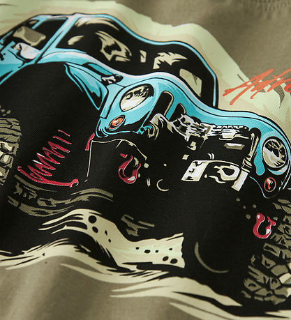 Snygg Name It tröja i olivgrön färg. Tröjan är dekorerad med ett stor tryck med en bil och texten "Adventure Ride". Den har långa ärmar och en rund halsringning.