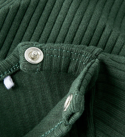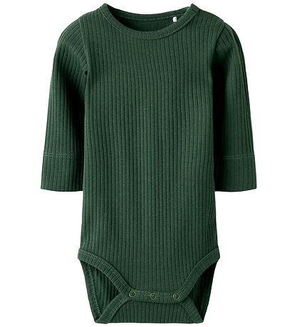 Snygg Name It body i en djup, grön nyans. Bodyn är tillverkad i en ribbad struktur och har långa ärmar och en rund halsringning, vilket bidrar till en klassisk design. Praktiska tryckknappar nertill gör det enkelt att öppna och stänga bodyn.