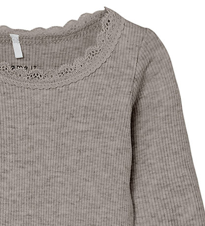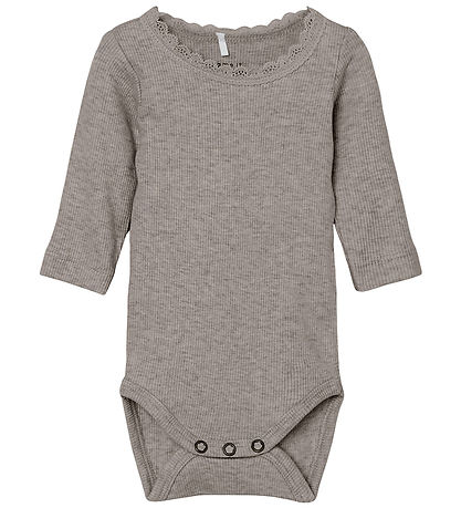 Elegant Name It body i en snygg gråbeige färg. Bodyn har en fin ribbad struktur och en delikat spetskant vid halsringningen, vilket ger en diskret touch. Name It bodyn har långa ärmar, vilket säkerställer en bra passform. Längst ner finns en praktisk stängning med tryckknappar, vilket gör det enkelt att öppna och stänga bodyn.