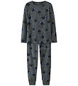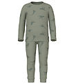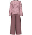 pyjamaströjan från Name It har en rund halsringning med smal ribbad kant och långa ärmar. Pyjamasbyxorna har en bra resår i midjan och breda ribbade muddar/ribbad mudd vid bensluten.