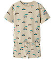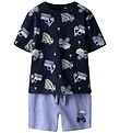 Smart Name It shortsset bestående av en t-shirt med horisontella ränder i vit, blå och marinblått och ett par marinblått sweatshorts. På vänster bröst och på vänster lår finns en söt, broderad elefant. Name It t-shirten har en rund halsringning med en smal ribbad kant och korta ärmar. Sweatshorts har en resår i midjan som kan justeras med knappar inuti. Framtill har dekorativa snöre/snörning och två sidofickor.