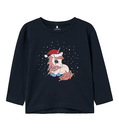 Charmig Name It tröja med långa ärmar i en blå färg och ett färgglatt enhörningstryck med tomtemössa och stjärnor framtill. Tröjan erbjuder stil och roligt för de minsta.