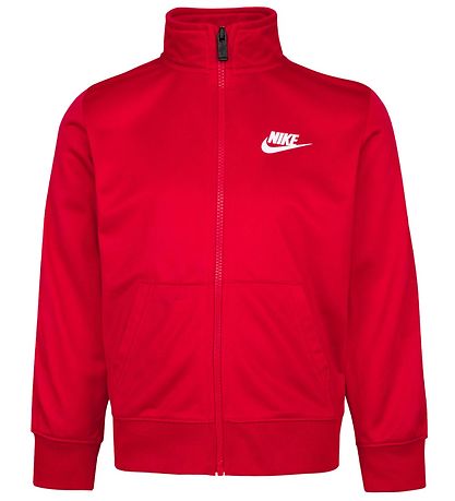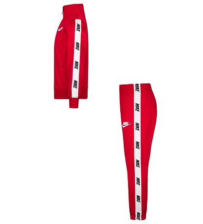 Cool Nike träningsset, som består av en cardigan och ett par byxor i röd, med vita kant med logotryck i svart längst upp på ärmarna och utsidan av byxbenen. På både vänster bröst och lår finns logotryck i vit.