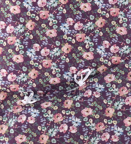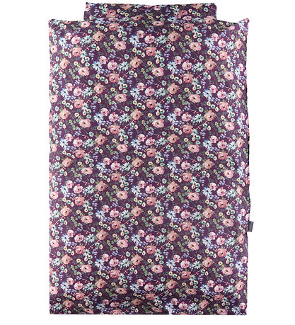 Vackra Nørgaard Madsens sängkläder i plommonlila med ett heltäckande blommönster i rosa, gröna, gula och blåvioletta färger.