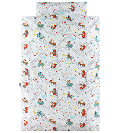 Vackra Nørgaard Madsens sängkläder i vit med ett färgglatt heltäckande tryck av olika djur och sliders.