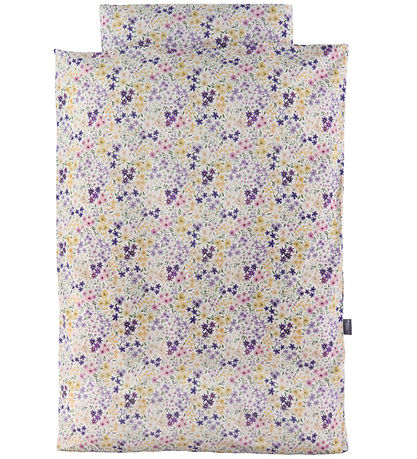Vackra Nørgaard Madsens sängkläder i vit med ett allovertryck av blommor i lila, rosa och gula nyanser.