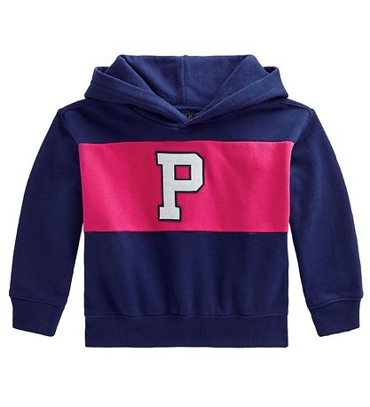 Smart Polo Ralph Lauren hoodie i blå svett, och över bröstet finns en bred rand med i rosa bokstäver "P" apllikeret i vit vit filt.