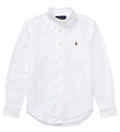 Polo Ralph Lauren skjortan har långa ärmar med vida kanter och två små vita knappar. I halsöppningen finns en klassisk krage och skjortan öppnas med vita knappar. Längre fram finns en stor, vacker volang. Skjortan är gjord i en mjuk, tätt vävd kvalitet.