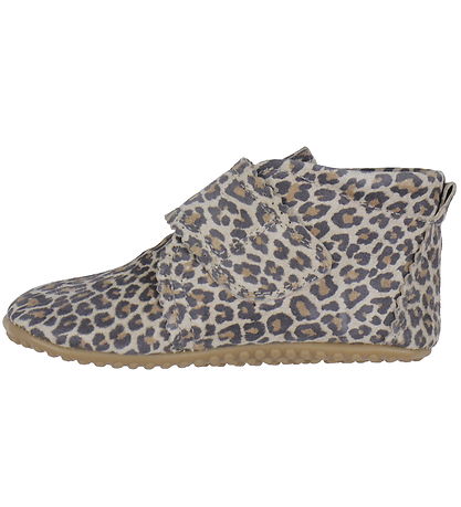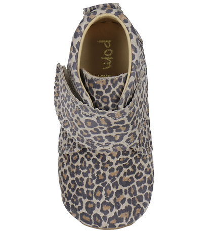 Pom Pom skinntofflorna är gjorda av mjukt läder, vilket ger en flexibel skor som inte klämmer, och öppnas över vristen med ett brett kardborreband. Insidan är fodrad med läder, och innersulan är gjord av mjukt läder och är uttagbar.