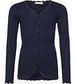 Vacker Rosemunde cardigan i en dämpad blå nyans med långa ärmar och en elegant ribbad struktur. Cardigan från Rosemunde har fin spetsar längs knappknäppningen och kanterna, vilket ger en fin twist. Passformen är åtsittande för en snygg look.