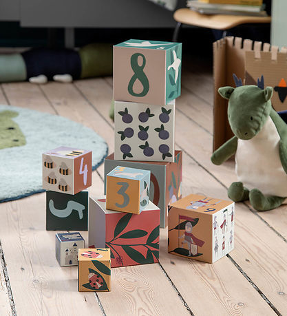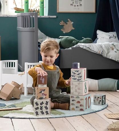 Klossarna kan staplas och användas som dekoration i barnrummet. Klossarna introducerar och lär barnet om de olika tal och djur, samtidigt som de stärker finmotoriken.